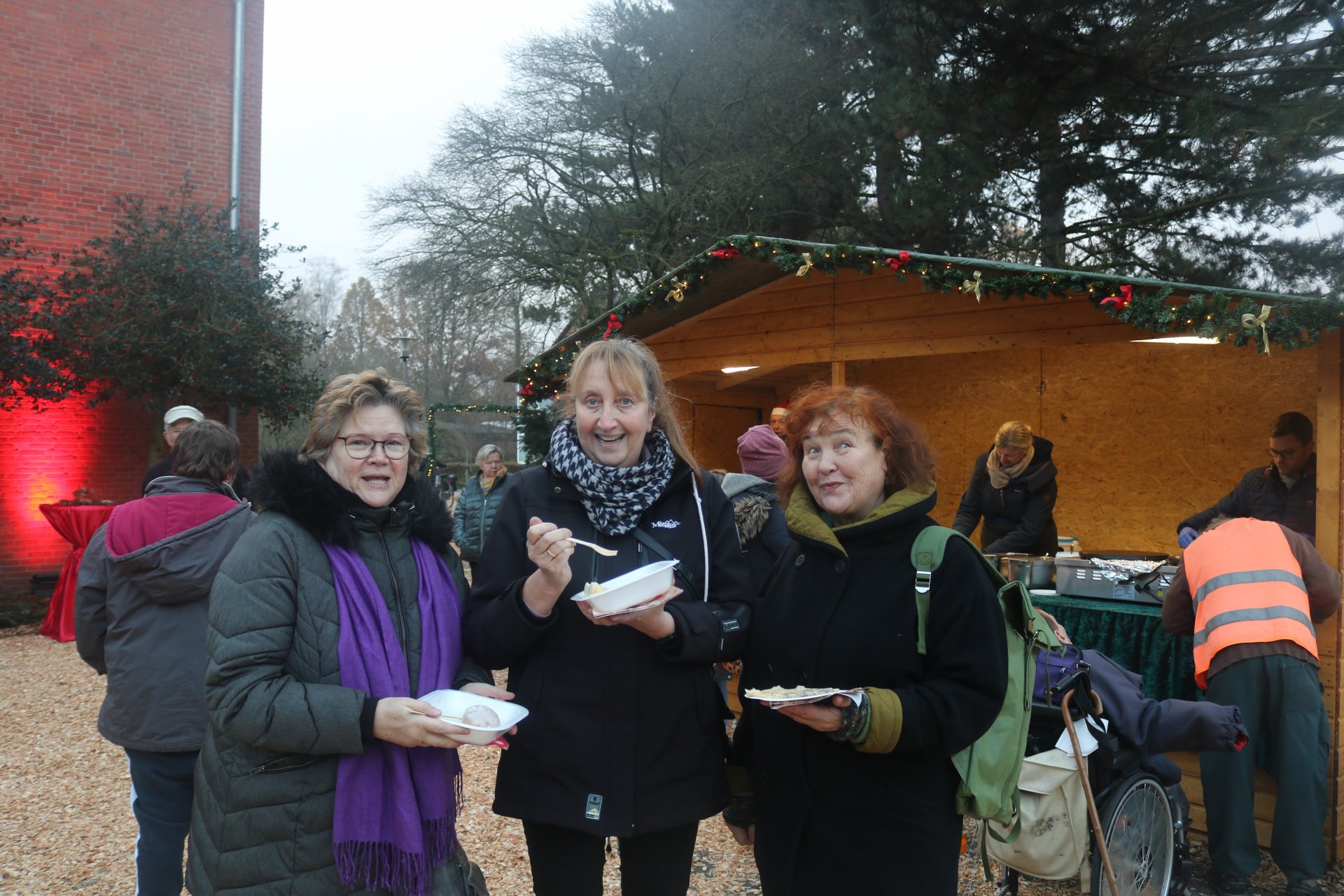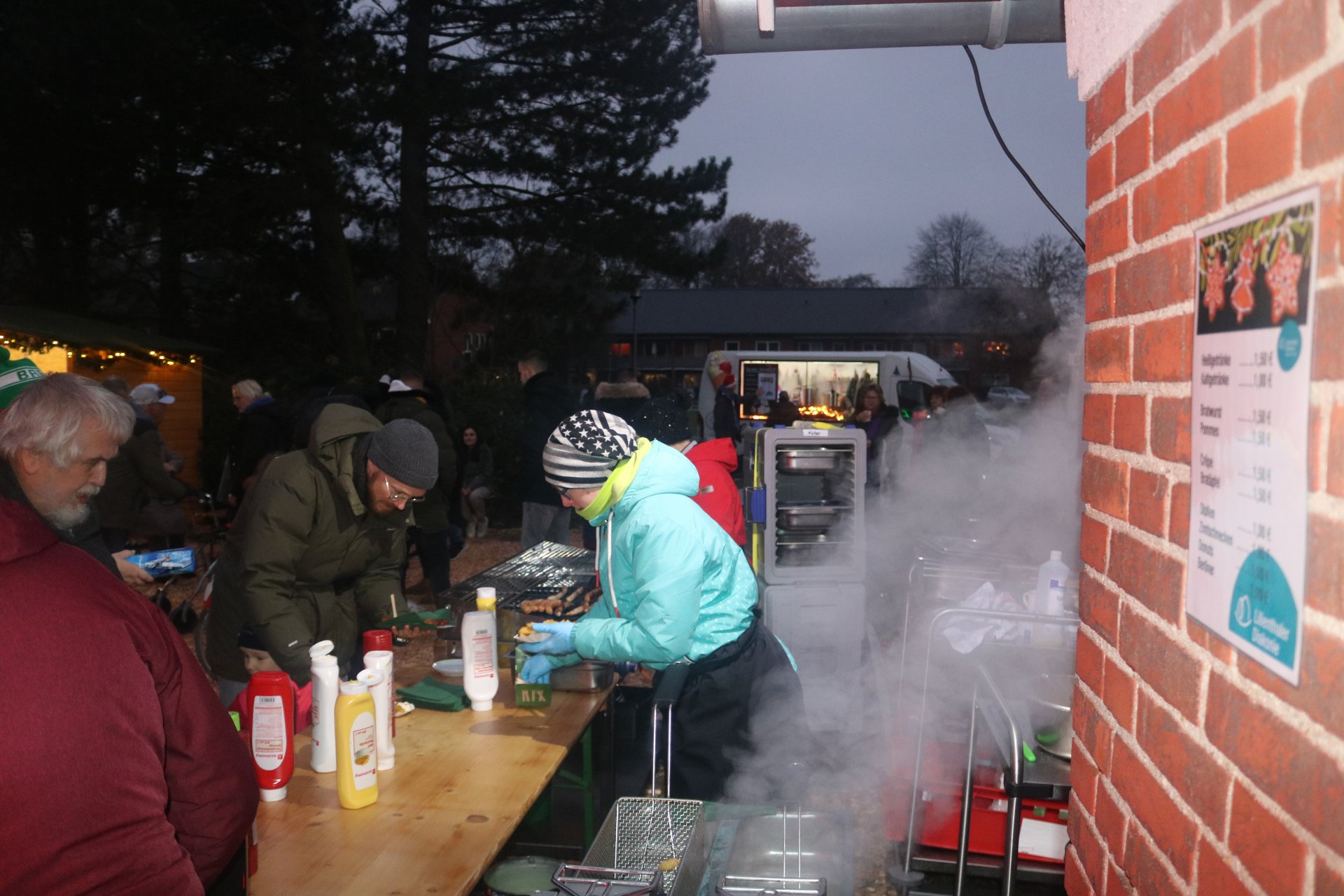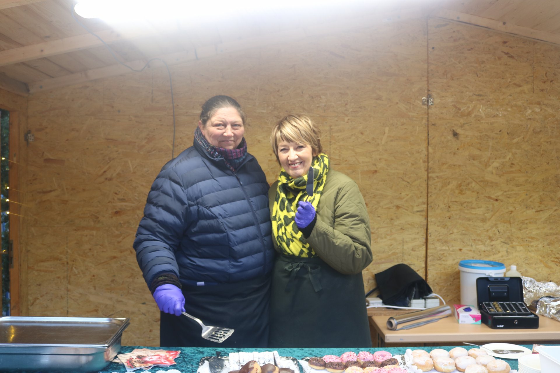 Gutgelaunte und motivierte Pommes- und Würstchenbräterinnen, Crêpes-Jongleure, Kuchen- und Bratapfelexpertinnen sowie das Getränke-Verkaufsteam und das tapfere "Kassen-Fräulein" strahlten trotz kaltem Wetter unverwüstlich fröhlich in die Kamera.