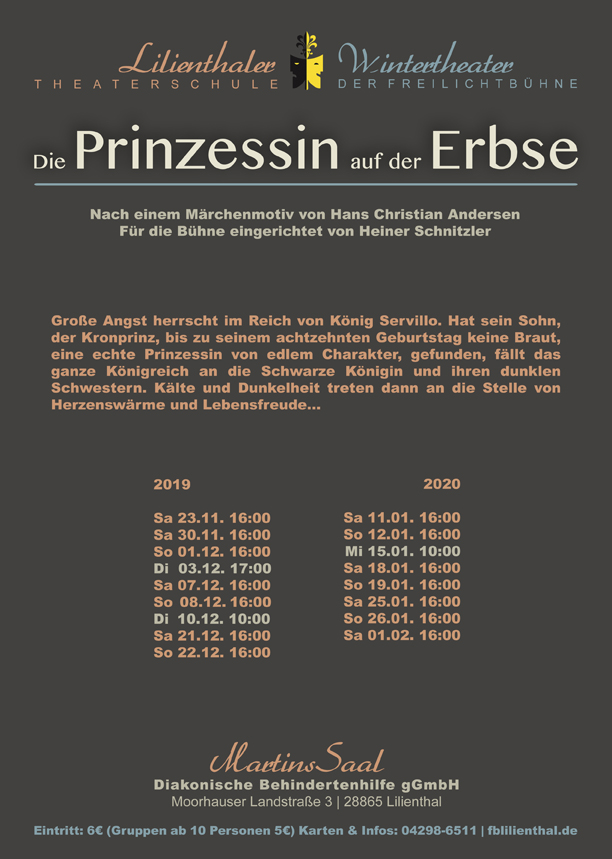 Die Premiere des Stück findet am 23. November 2019, um 16.00 h, im MartinsSaal an der Martinskirche, auf dem Campus der Diakonischen Behindertenhilfe gGmbH, Moorhauser Landstr. 3a, 28865 Lilienthal, statt.