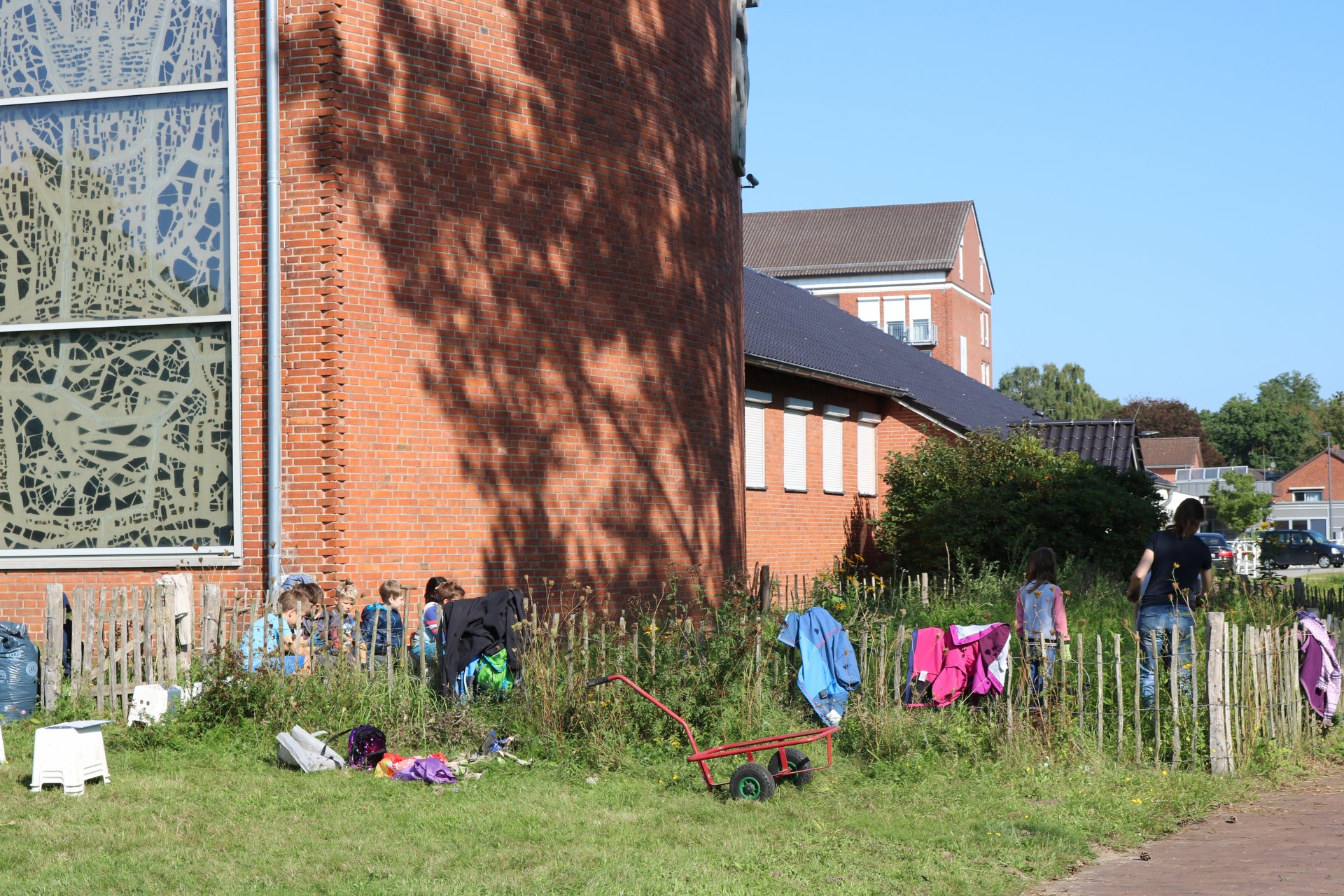 Bzgl. des Wetter hatten nicht alle Klassen Glück. Die Dienstagsgruppe wurde für ihre Fleißarbeit mit strahlendem Sonnenschein belohnt. Die Mittwochsgruppe musste die Gartenaktion im Regen bewältigen. Die Donnerstagsgruppe kam mit einem Mix aus Sonne und Wolken (ohne Regen) durch den Tag. Das wechselhafte Wetter störte die Akteure jedoch nicht. Es wurde fleißig gearbeitet und auch gespielt.