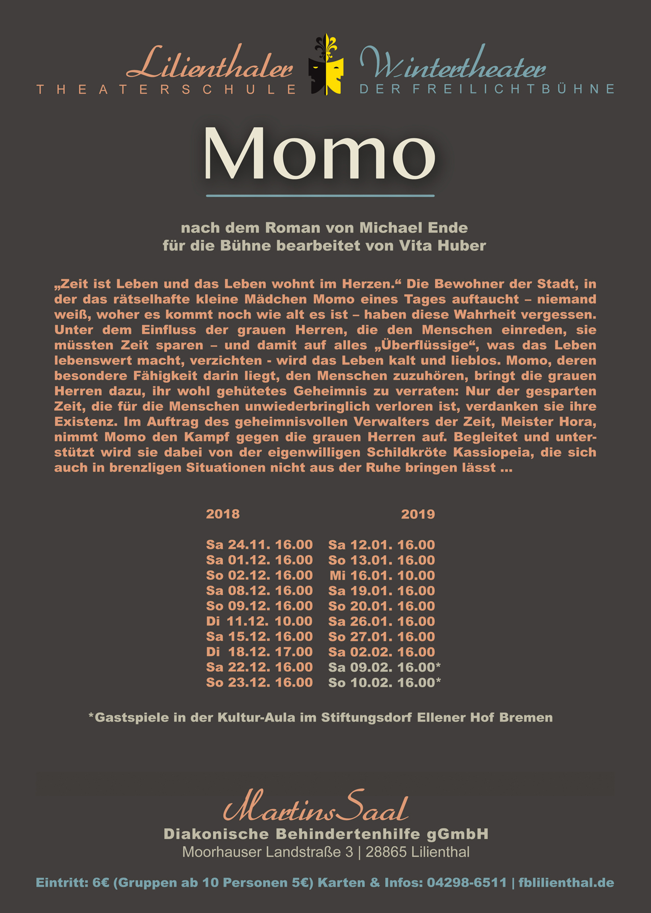 Diese beginnen im November 2018 im MartinsSaal der Diakonischen Behindertenhilfe gGmbH, Moorhauser Landstr. 3a, 28865 Lilienthal und enden im Februar 2019 mit einem Gastspiel in der Kultur-Aula im Stiftungsdorf Ellener Hof in Bremen.