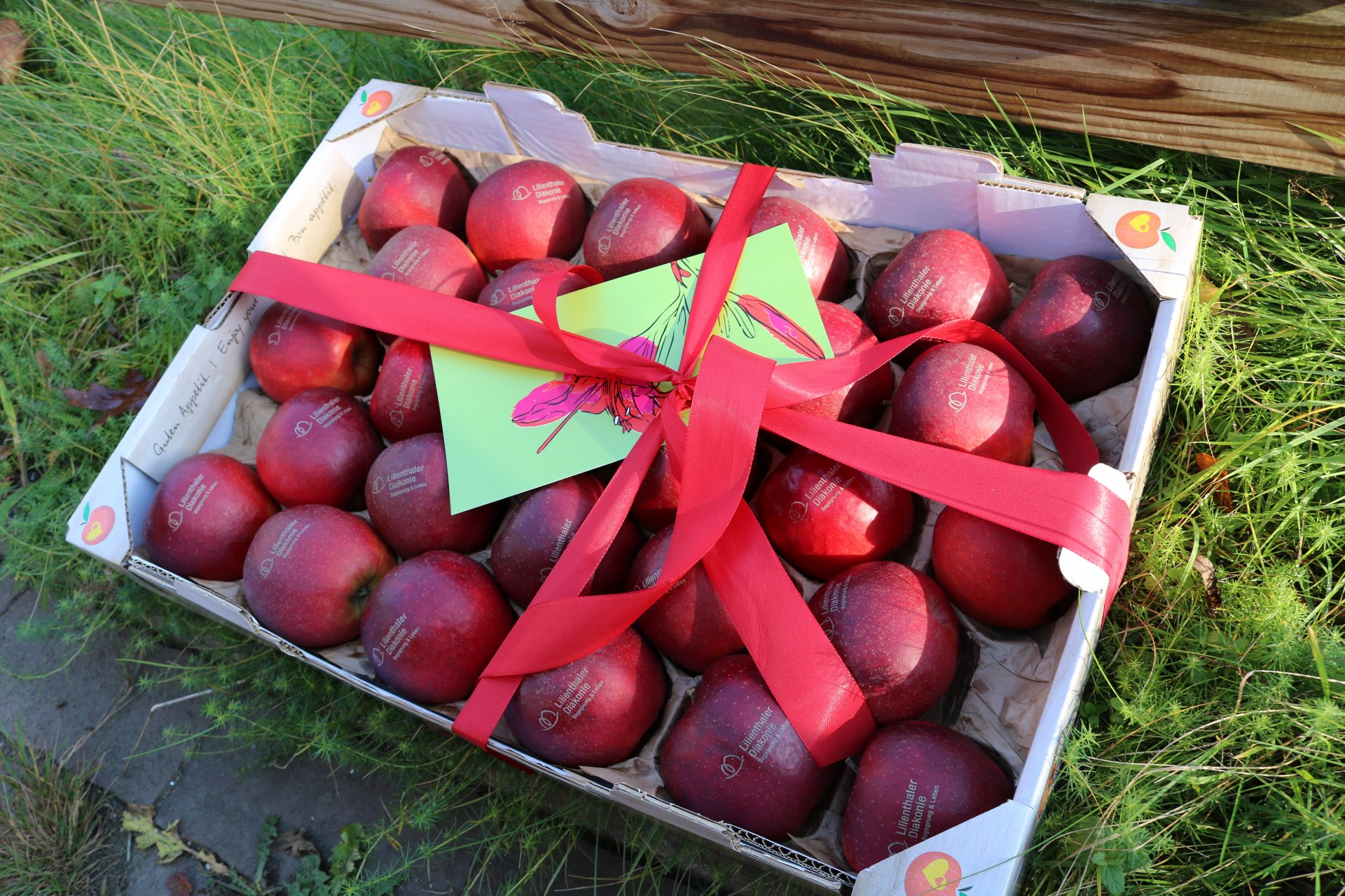 Als besonderes Präsent zur Umfirmierung überreichte Frau Brinkmann - sowohl im Auftrag von Witthohn Design als auch im Namen der Wilbri GmbH, die das Banner mit vor der Tür gefertigt hatte - zwei große Körbe mit rotbackigen Äpfeln, die mit unserem neuen Namen und Logo versehen waren. Ein schönes Geschenk. Und lecker waren sie auch noch.