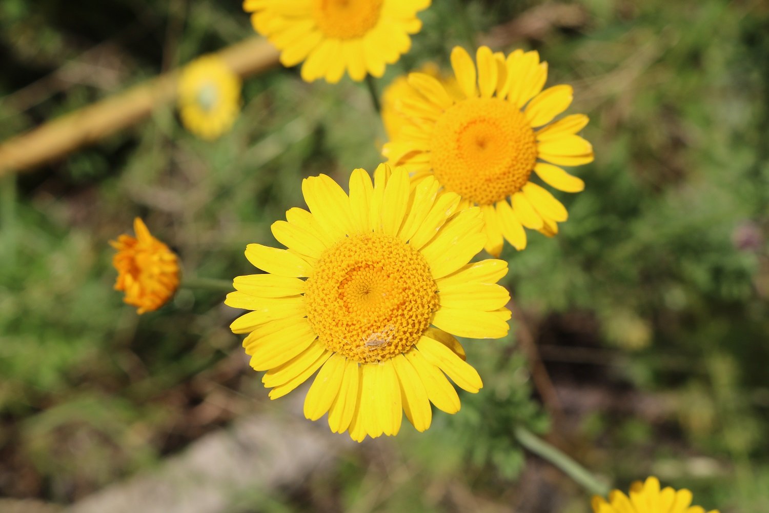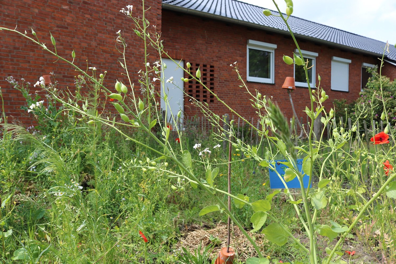 Besonders schön in diesem Jahr ist, dass im Gemüsebeet auch viele Wildblumen ihren Platz gefunden haben und einträchtig mit den Kürbispflänzchen um die Wette strahlen.