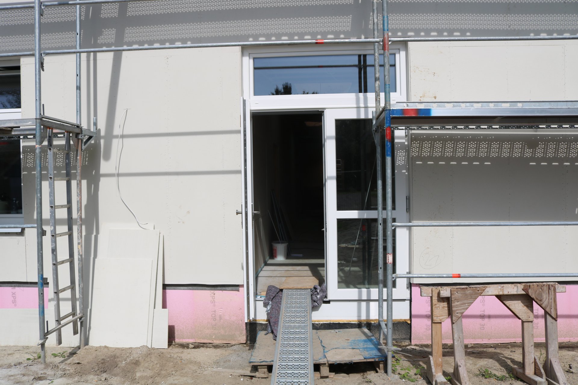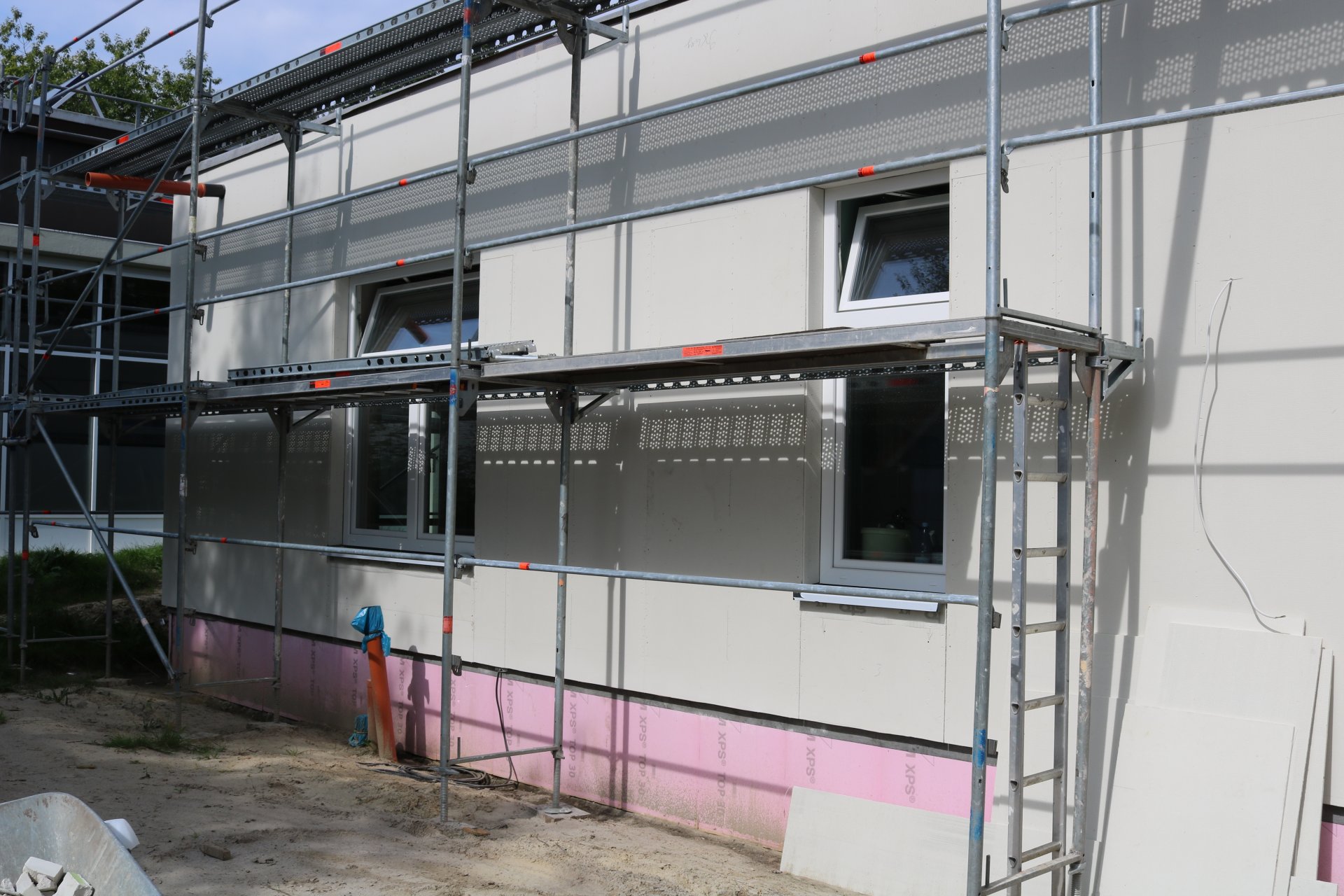 Im Außenbereich ist ein Fortschritt ebenfalls erkennbar. So sind die brauen OSB-Platten verkleidet und die Fassade lässt erahnen, wie es nach Fertigstellung aussehen wird.