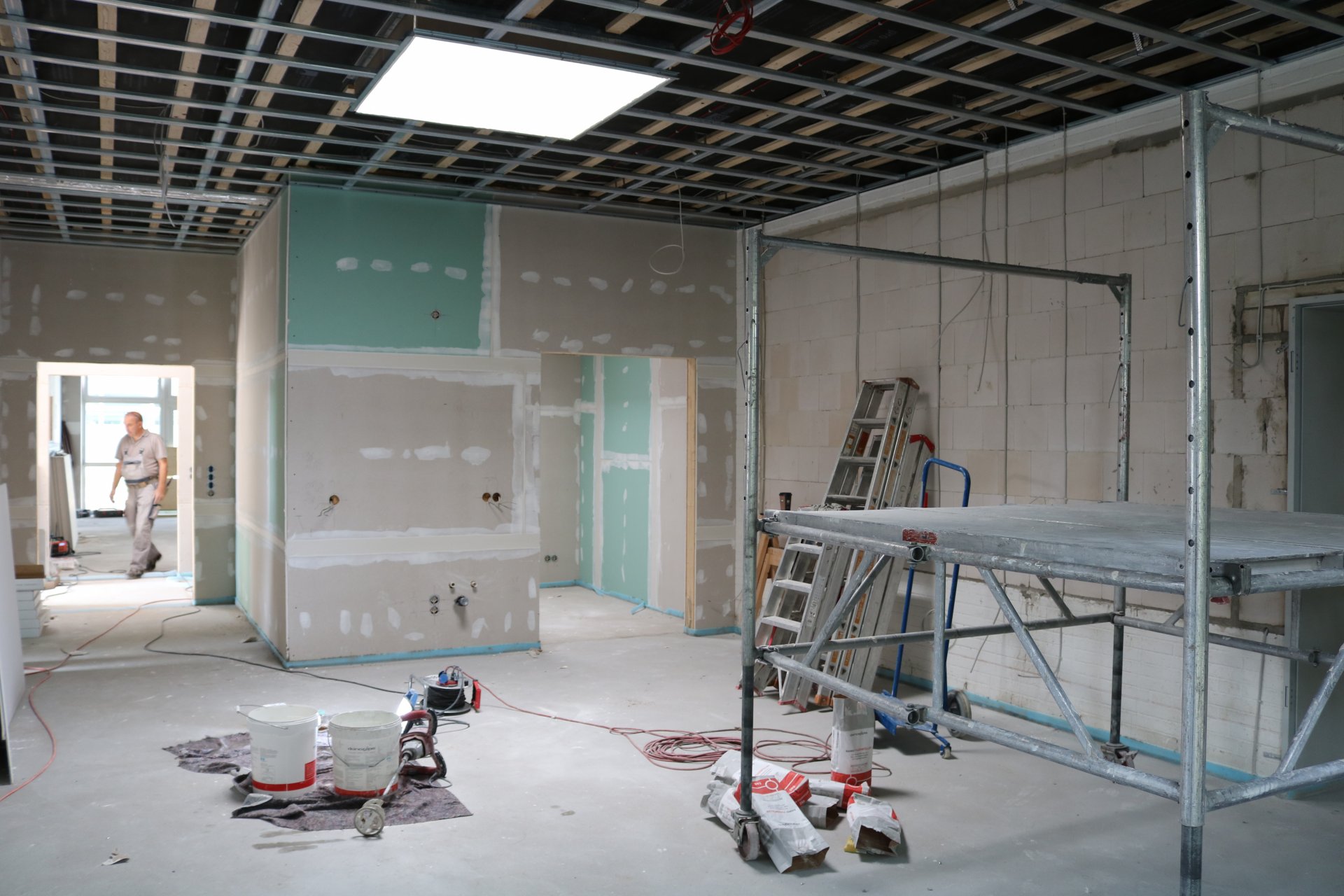 Derzeit werden die Decken eingebaut und die Fliesenleger sind am Werk.
