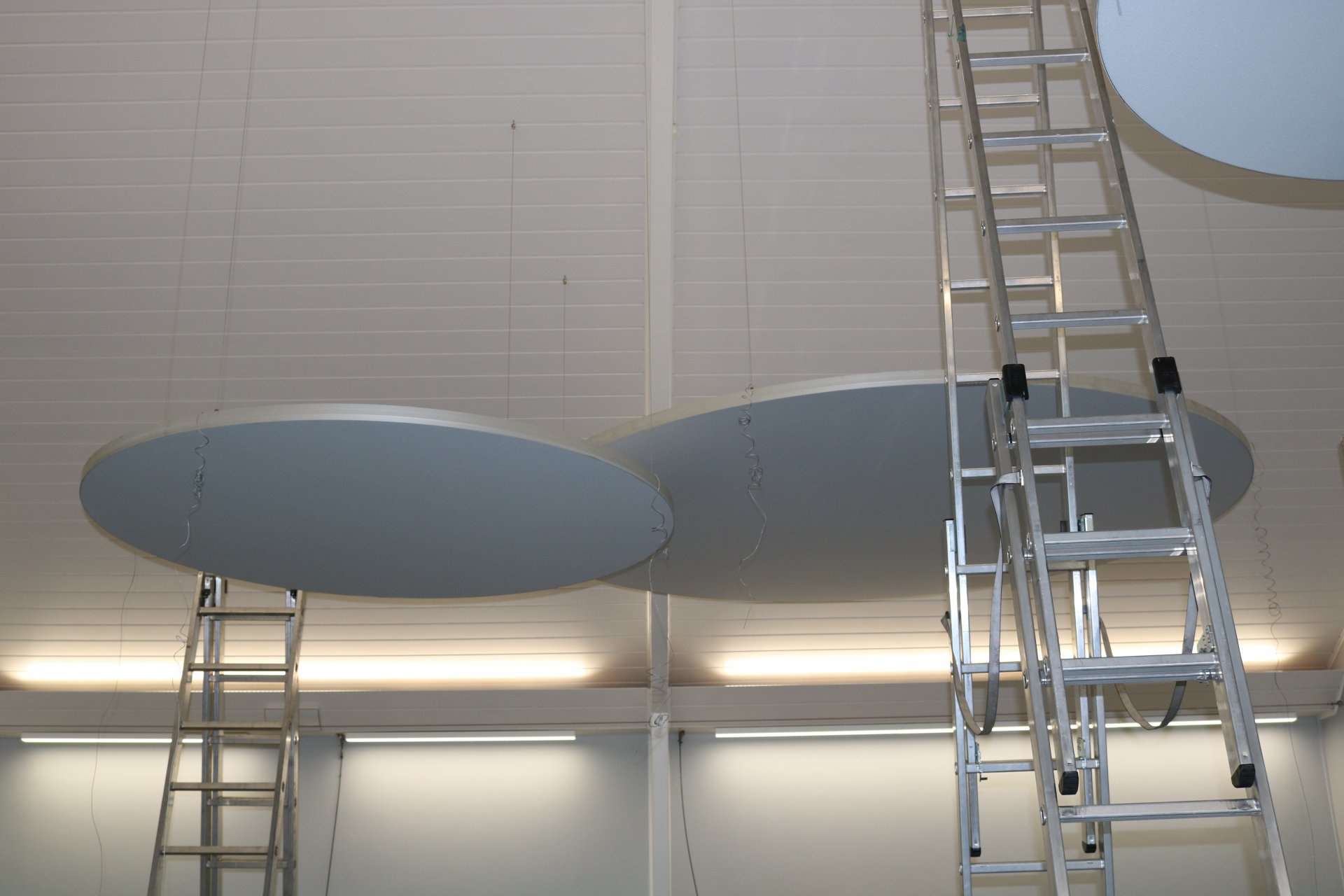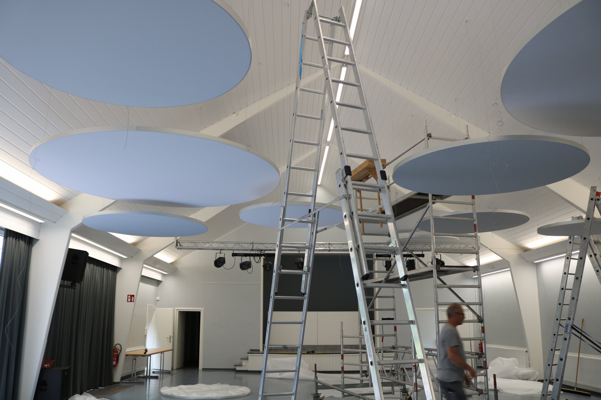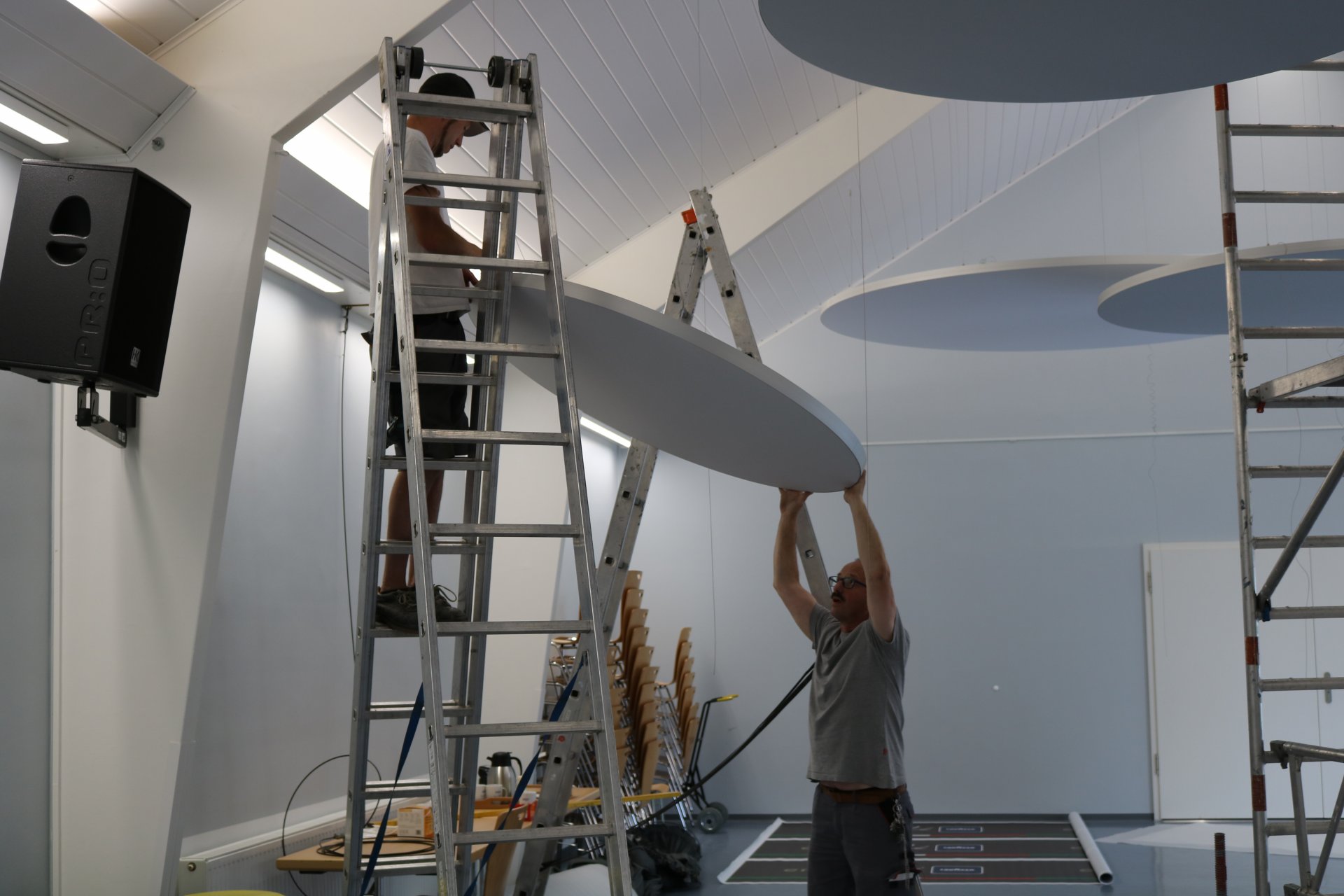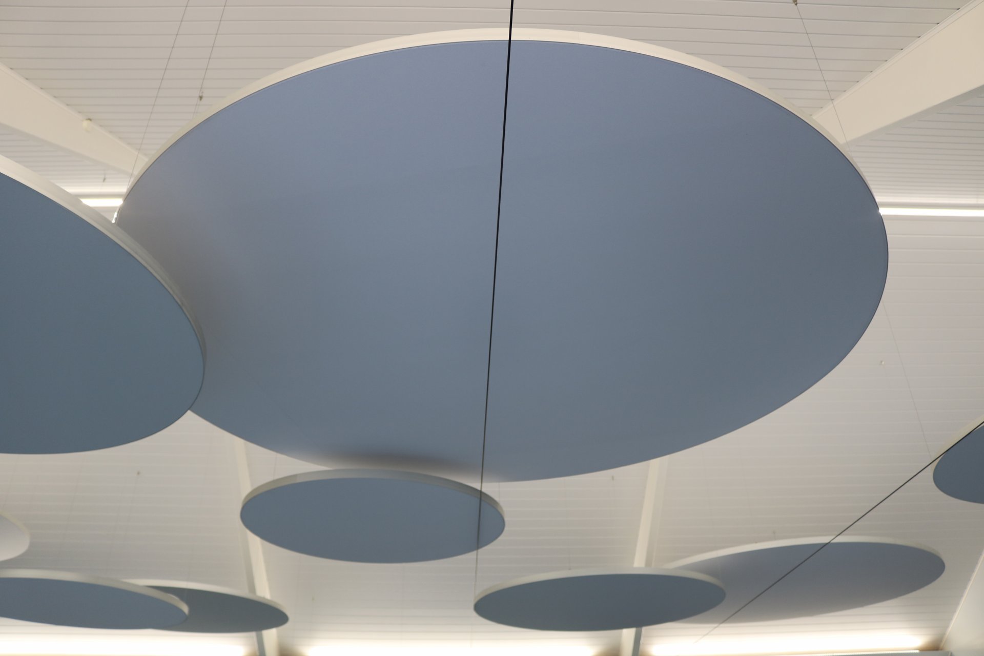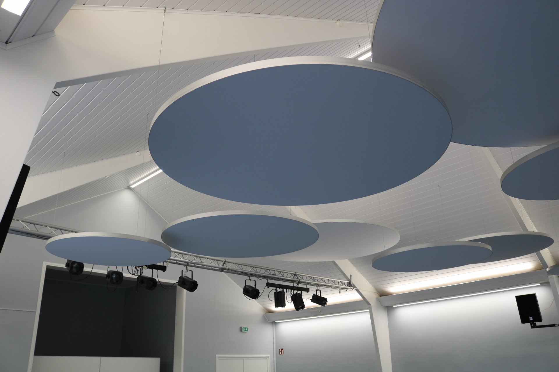 Mit der Montage der runden Deckenpaneele, die vielleicht ein wenig futuristisch anmuten, wurde der Nachhall um 50 % reduziert. Ein sensationelles Ergebnis.